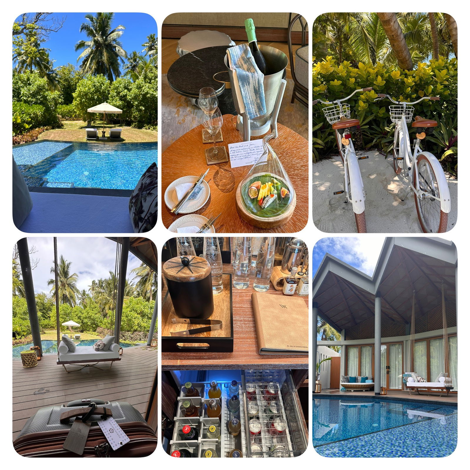Vi ble kjørt til villaene de få hundre meterne i en golfbil/buggy, og utenfor villaen stod syklene våre klare med navneskilt på. Villaen i seg selv var mer enn vi forventet, stor, moderne og utsøkt på alle måter. Oppholdsrom med minibar (burde hete maxibar) med stort utvalg av snaks og drikke.